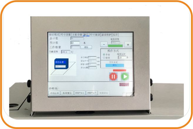 人機交互界面,中文文字與圖像相結合顯示10吋觸控主控彩屏,銑背深度、底膠和側膠量大小、壓痕位置和深度、斷膠位置、方圓脊等均可方便設定調整,具備操作記錄、數據存儲、工效統計等功能。